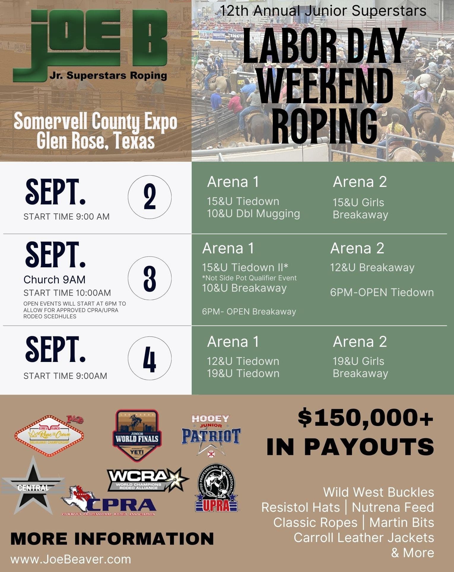 Don’t miss this 3-day event with $150,000+ in payouts for junior ropers at the Somervell County Expo Center!